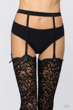 A visually impressive pair of hold -ups from the Ballerina Spring collection. Comprising of a deep lace band with decorative filigree design beneath, leading in a dotted seam to a scroll motif that continues into a reinforced pointed heel.