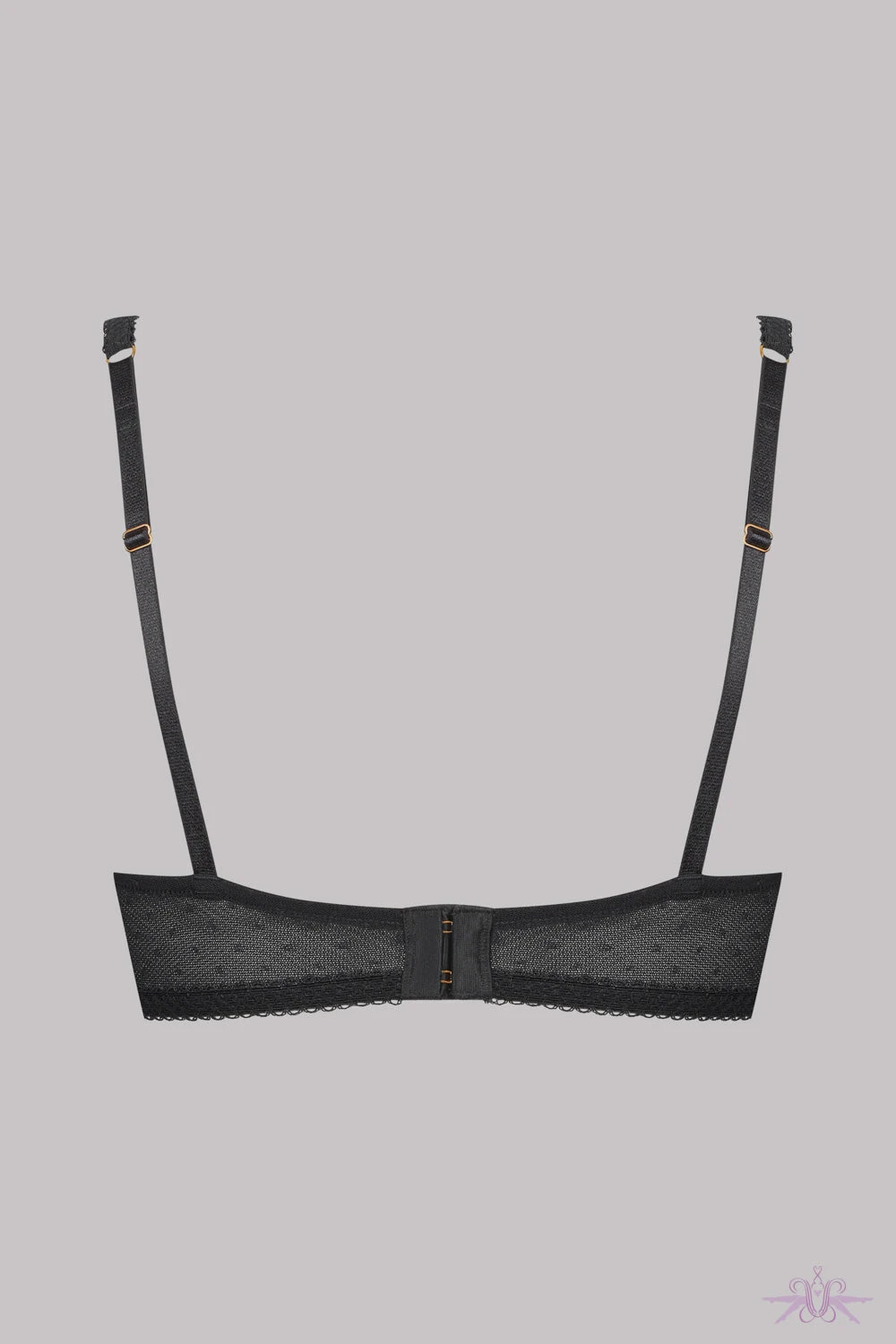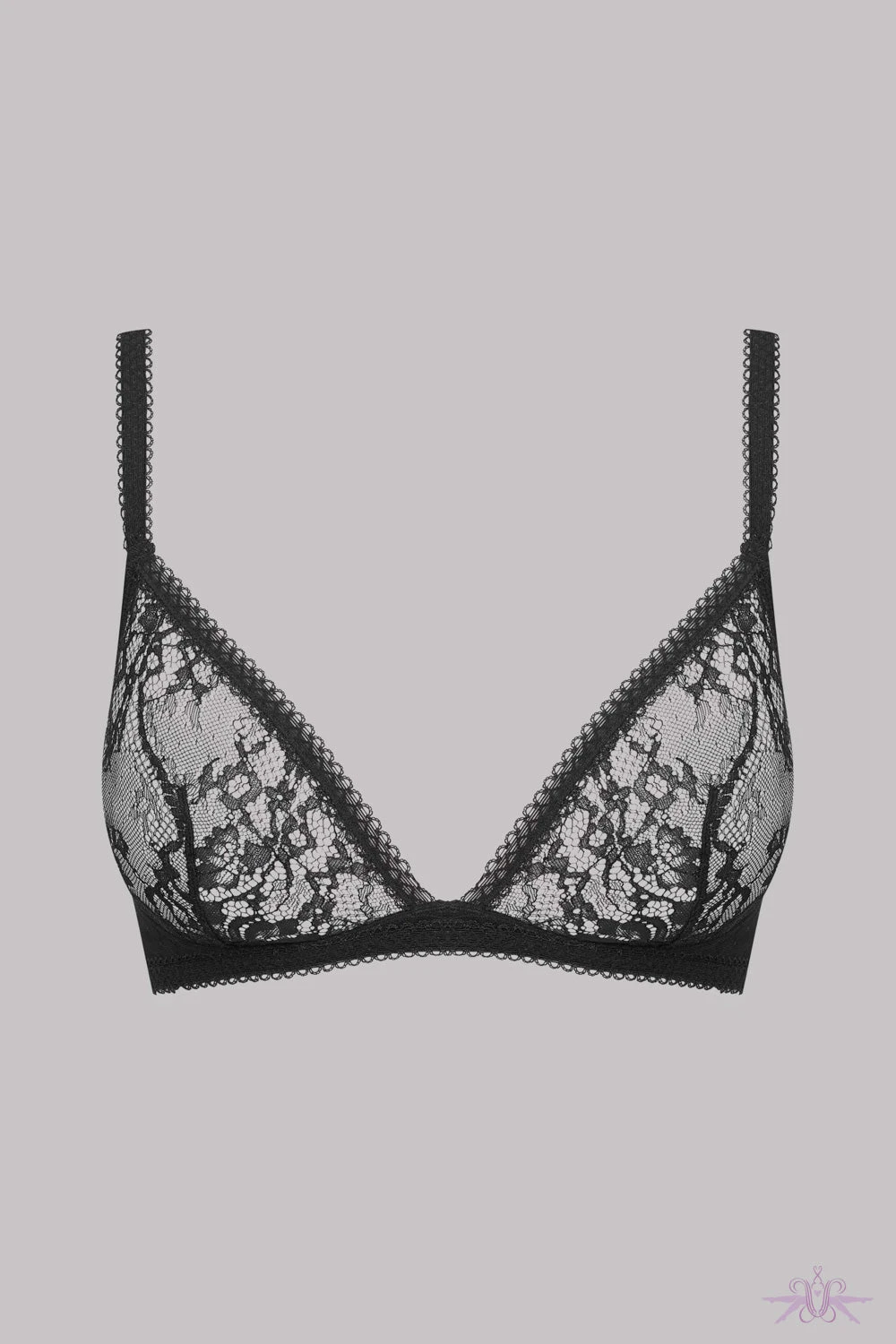Feminine and chic is this gorgeous triangle bra from the Inspiration Divine collection. The soft and stretchable fabric on the triangular cups shapes the breast beautifully. It is so comfy as it doesn’t have underwire or any rigid materials, it is simply modern and elegant. A sumptuous transparent floral lace reveals your assets. Finish the look with the matching mini or openable thong and harness.