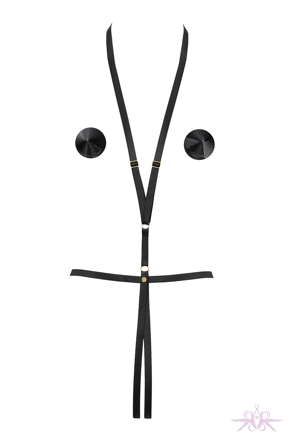 The harness from the Le Petit Secret Magnet collection at Maison Close is a must have accessory. On the front a golden button offers a magnetic, original and fast opening. Stretchy and adjustable this underwear adjusts easily to the silhouette, for light and comfortable wearing. For more fantasy black nipple covers come with the harness.