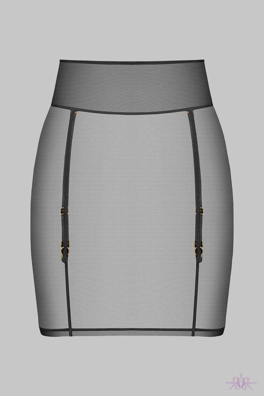 A stunning short garter skirt in sheer mesh from the new collection at Maison Close. This seductive skirt has a snug fit and good under clothing. The cross seams coordinate with the removable garters. A gorgeous slip skirt to wear over other pieces in the collection.