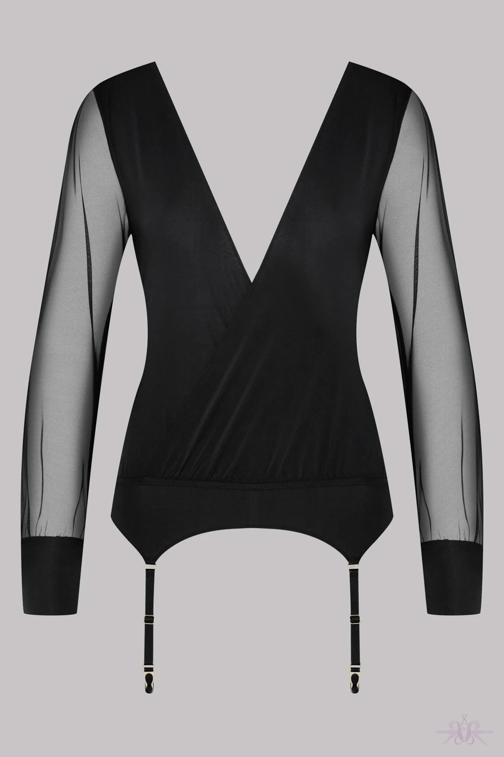 A decadent long sleeved bodysuit from the Madame Reve collection at Maison Close. This bodysuit in opaque microfiber has a sheer mesh back and long floaty sleeves with slight gathers at the shoulders. The four suspender straps are adjustable and removable making this a gorgeous versatile piece of lingerie.