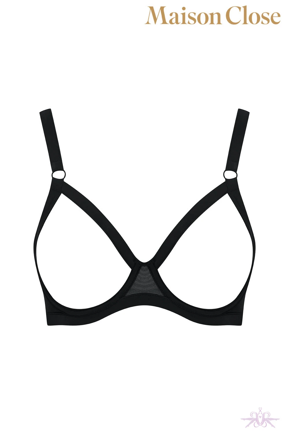 Daring and suggestive is the naked breast bra from Maison Close. It features a naked breast cut offering audacity and support. This seductive underwear is incredibly soft with its extraordinary refinement. A semi-transparent tulle panel decorates the edging and the adjustable straps ensure a good fit. To increase desire wear with the matching high hips thong and garter belt.