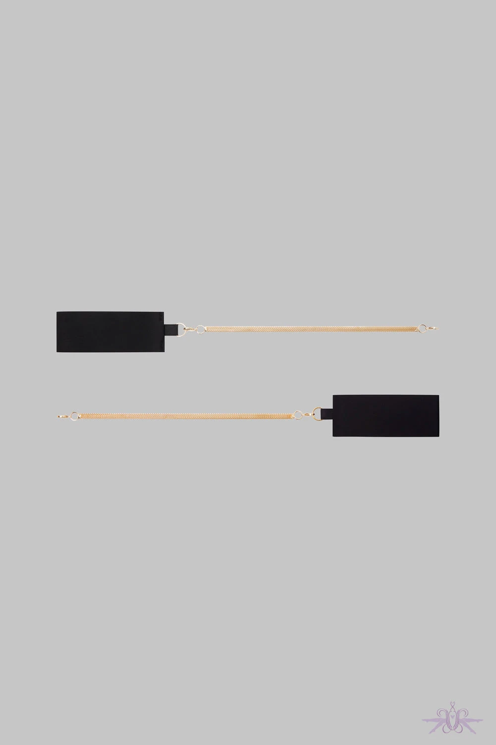 A sensual pair of removable handcuffs from the Tapage collection at Maison Close. They have gold chains and microfibre straps. They easily and endlessly attach and detach to suit the desire. they can be attached to each other or to other pieces in the collection.