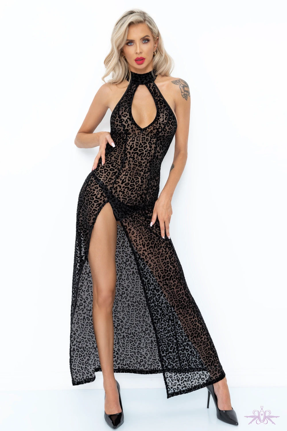 A glamorous sheer tulle long dress from the Boudoir Stories collection at Noir Handmade. This sheer long dress is seductive with a low back, high side split and cut out detail to the chest.The sheer velvet leopard flock design makes this a stand out piece in the collection.