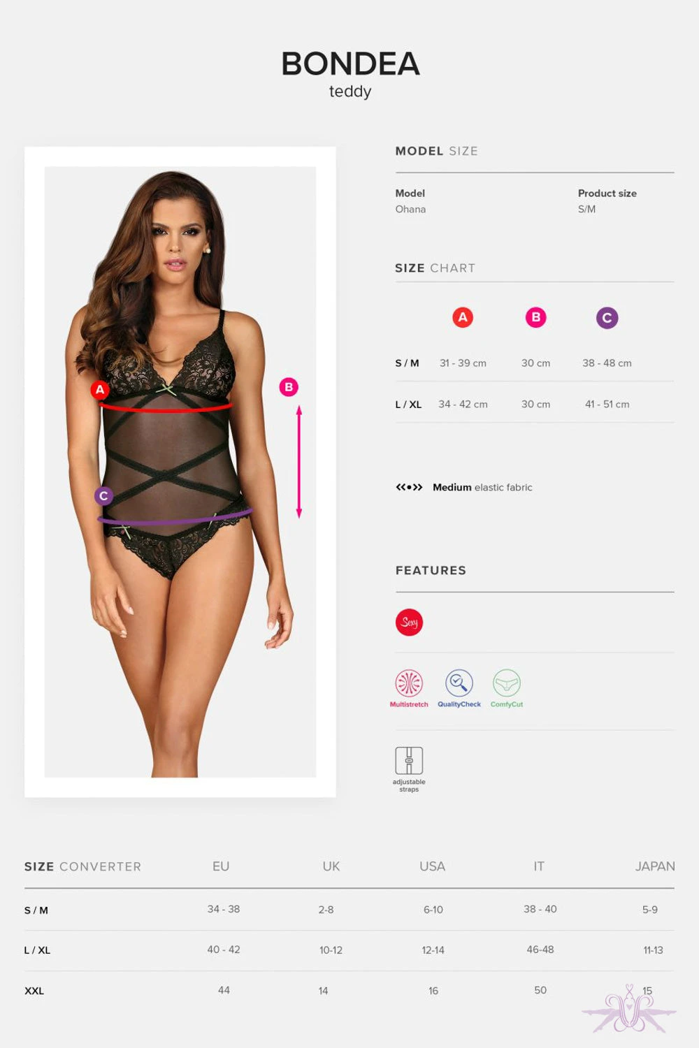 An elegant sheer teddy from Obsessive with decorative strap detailing across the body. The soft cups shape the breast beautifully. The panty area is a tempting lace style. A gorgeous addition to your lingerie collection.