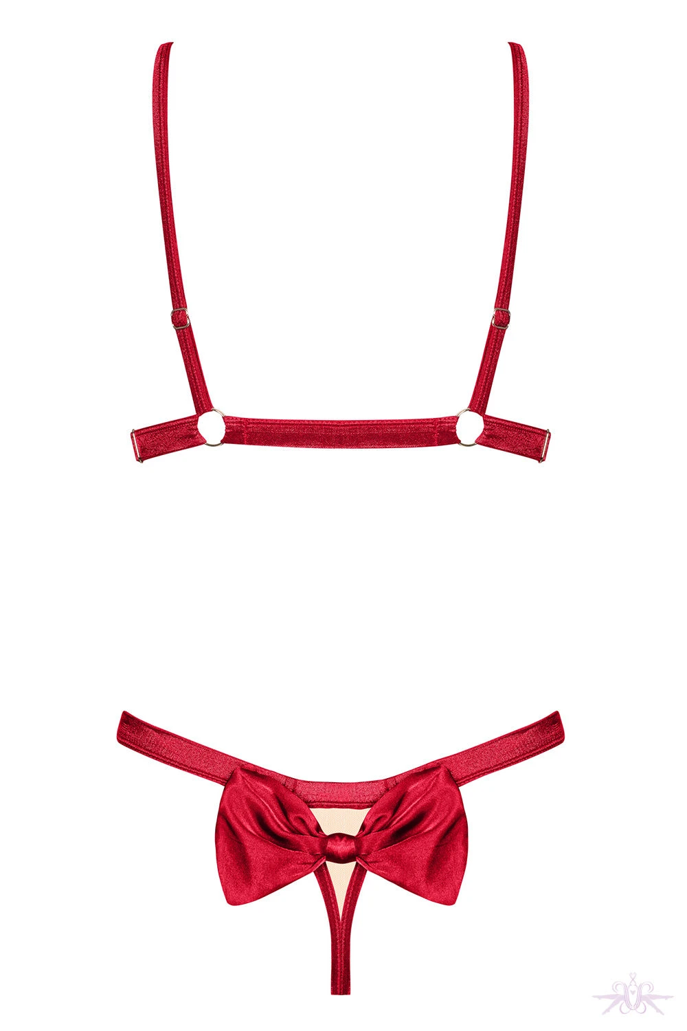 A seductive and extremely attractive two piece set that will definitely excite. It will ignite the fire and desire, seducing with the bows on the breasts and shimmering, golden seams. The set comprises of a cupless bra and matching thong made of tempting satin.