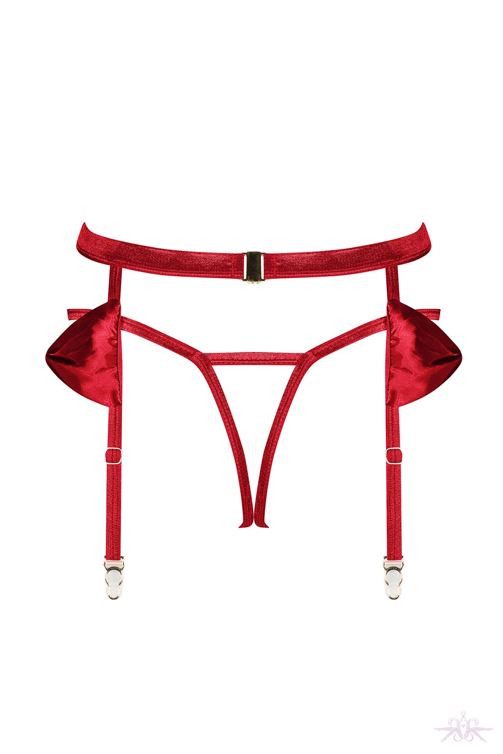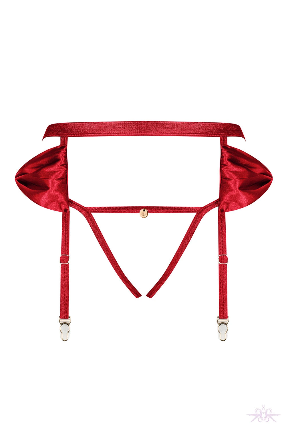 An stunning suspender belt that will entice the senses. A beautiful garter belt and open thong with cute satin bows that emphasise the hips at the sides and adjustable garter straps. Adorned at the front with a gold shiny pendant complete the look of this playful and alluring piece