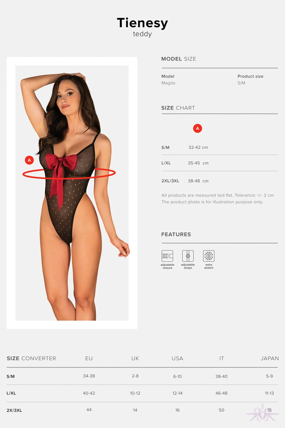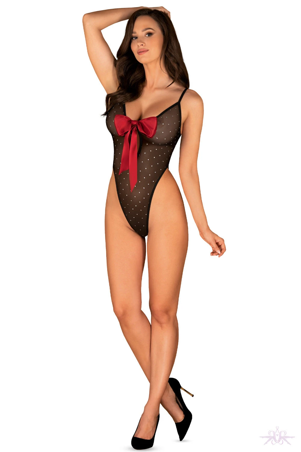 A gorgeous black sheer mesh bodysuit with tempting polka dot design. It has a lovely soft red satin bow at the front and adjustable fitting on the shoulder straps and a bra fastening to the rear. Featuring a daring open back and side adjusters to the thong briefs for the perfect fit. The low plunge neckline adds a glamorous edge is also openable.