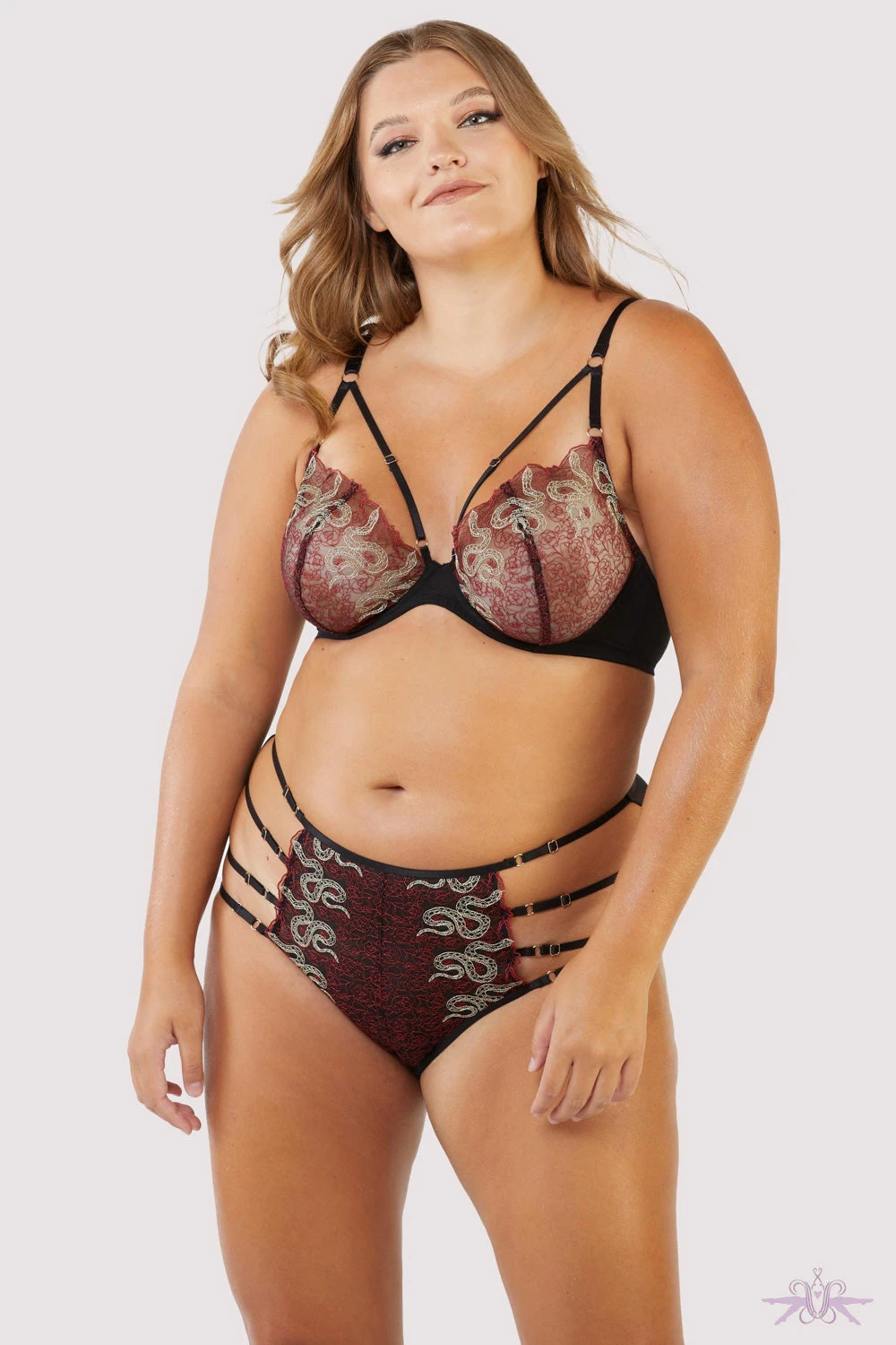 A striking high waist brief from the autumn collection at Playful Promises. This gorgeous brief is in autumnal colours with snake embroidery over black mesh and glistening gold and red embroidered florals. There are four elastic straps to each side that are adjustable.