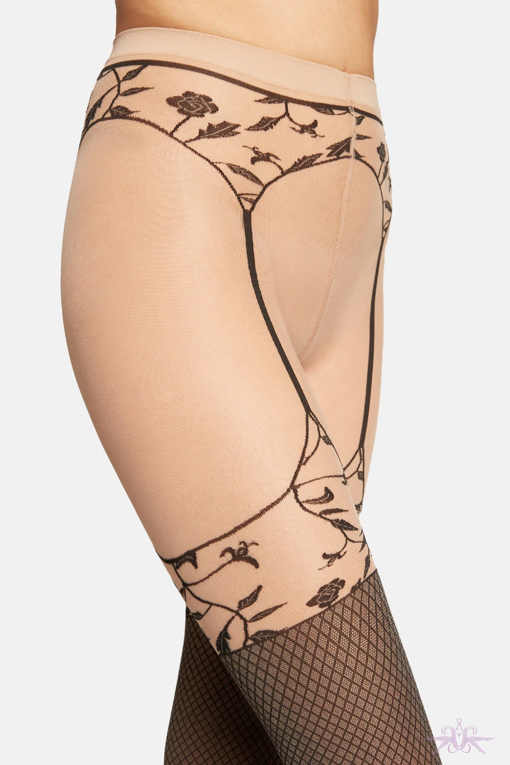 Opaque and sheer tights from Wolford with a wonderful faux suspender effect. These comfortable, soft tights with a delicate floral stocking belt effect leading to criss cross opaque leg. A Wolford logo placed under the comfortable knitted waistband gives this piece its signature look.